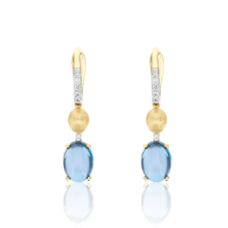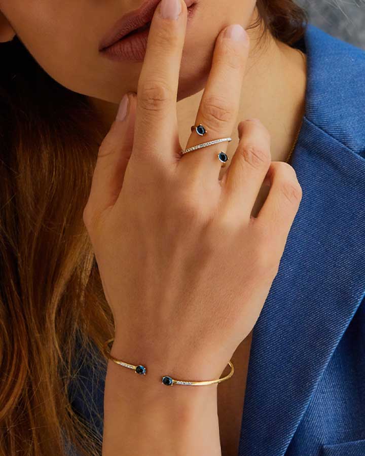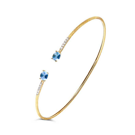 В коллекции Dancing Stones от Nanis мастера используют эффектный контраст теплого желтого золота и холодного лондон топаза. Камень привлекает внимание своим глубоким синим оттенком и особым внутренним светом, а фирменное сатинированное золото Nanis смягчает контраст, создавая гармоничное сочетание.